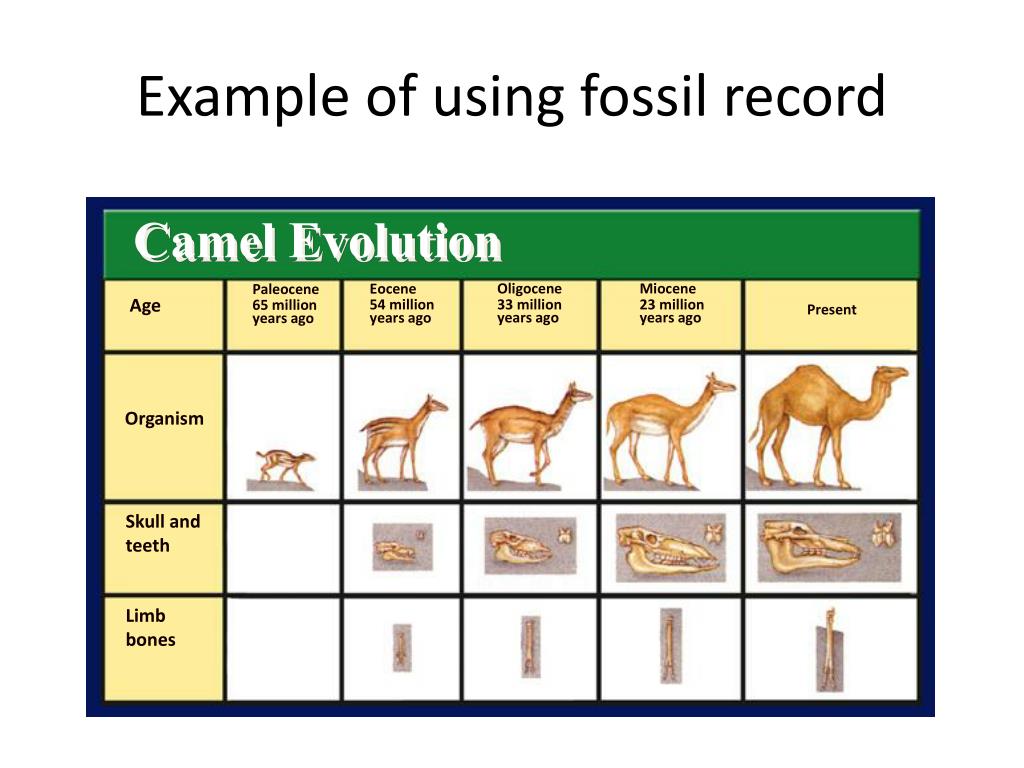 Example of using fossil record Camel Evolution Oligocene 33 million years ago Miocene 23 million years ago Eocene 54 million years ago Paleocene 65 million years ago Age Present Organism Skull and teeth Limb bones