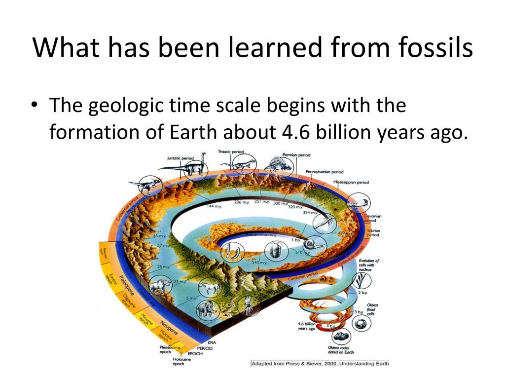 What has been learned from fossils • The geologic time scale begins with the formation of Earth about 4.6 billion years ago.