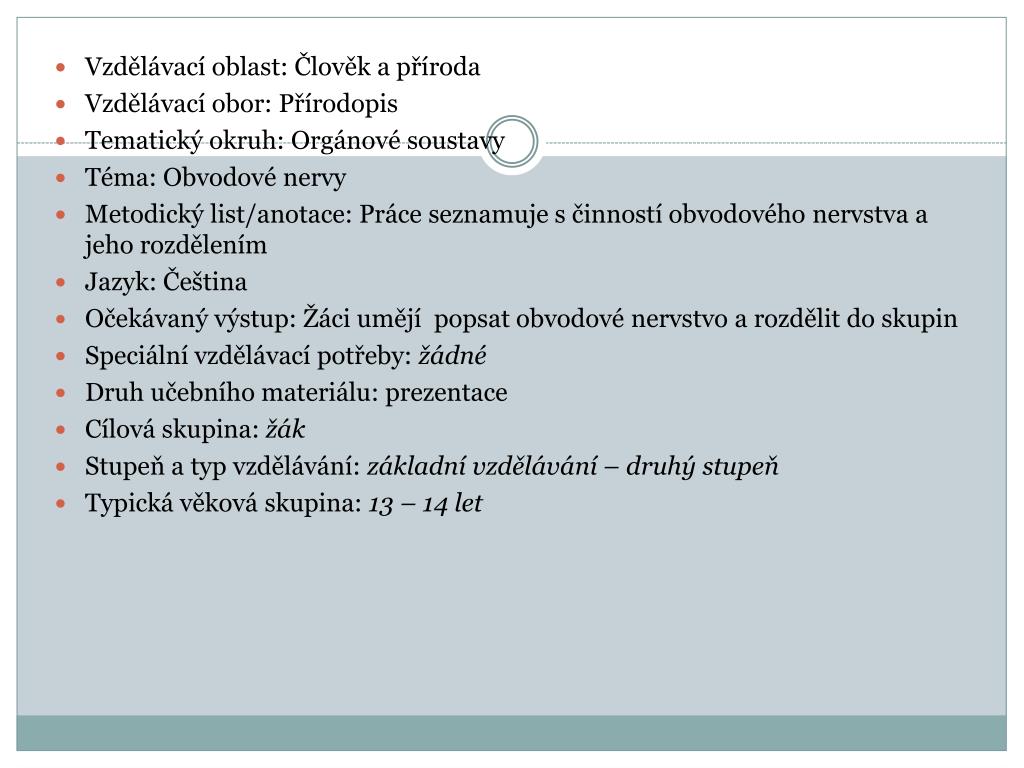 Vzdělávací oblast: Člověk a příroda • Vzdělávací obor: Přírodopis • Tematický okruh: Orgánové soustavy • Téma: Obvodové nervy • Metodický list/anotace: Práce seznamuje s činností obvodového nervstva a jeho rozdělením • Jazyk: Čeština • Očekávaný výstup: Žáci umějí popsat obvodové nervstvo a rozdělit do skupin • Speciální vzdělávací potřeby: žádné • Druh učebního materiálu: prezentace • Cílová skupina: žák • Stupeň a typ vzdělávání: základní vzdělávání – druhý stupeň • Typická věková skupina: 13 – 14 let