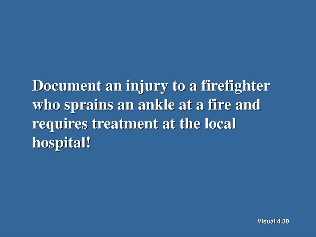 Document an injury to a firefighter who sprains an ankle at a fire and requires treatment at the local hospital!