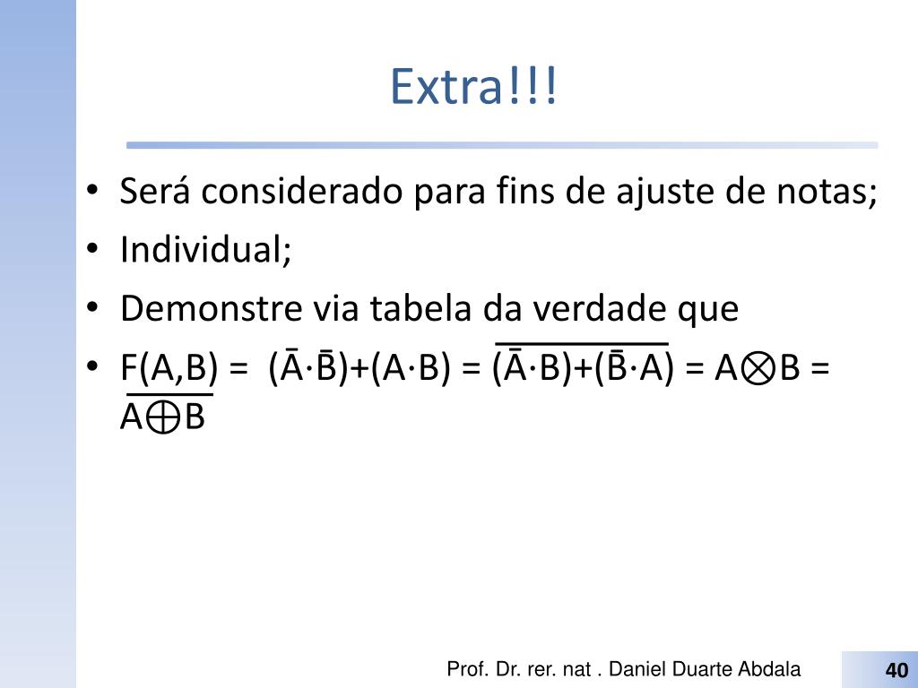 Extra!!! Será considerado para fins de ajuste de notas; Individual; Demonstre via tabela da verdade que F(A,B) = (Ā⋅B̄)+(A⋅B) = (Ā⋅B)+(B̄⋅A) = A⊗B = A⊕B Prof. Dr. rer. nat . Daniel Duarte Abdala