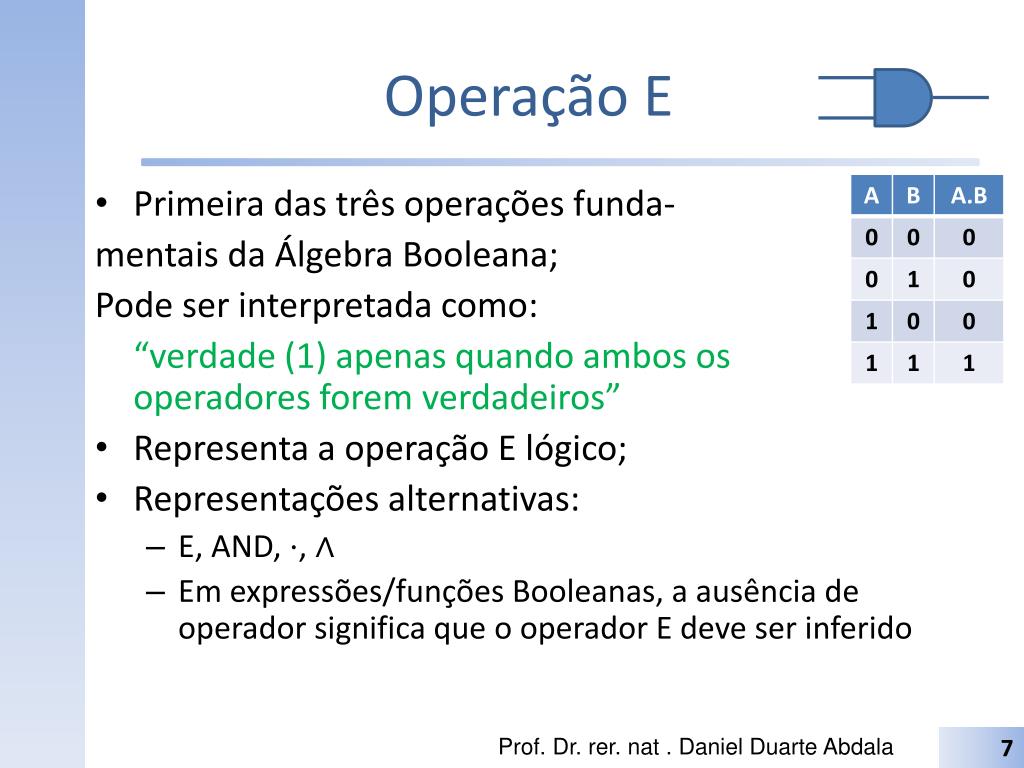 Operação E • Primeira das três operações funda- mentais da Álgebra Booleana; Pode ser interpretada como: “verdade (1) apenas quando ambos os operadores forem verdadeiros” • Representa a operação E lógico; • Representações alternativas: • E, AND, ⋅, ∧ • Em expressões/funções Booleanas, a ausência de operador significa que o operador E deve ser inferido Prof. Dr. rer. nat . Daniel Duarte Abdala