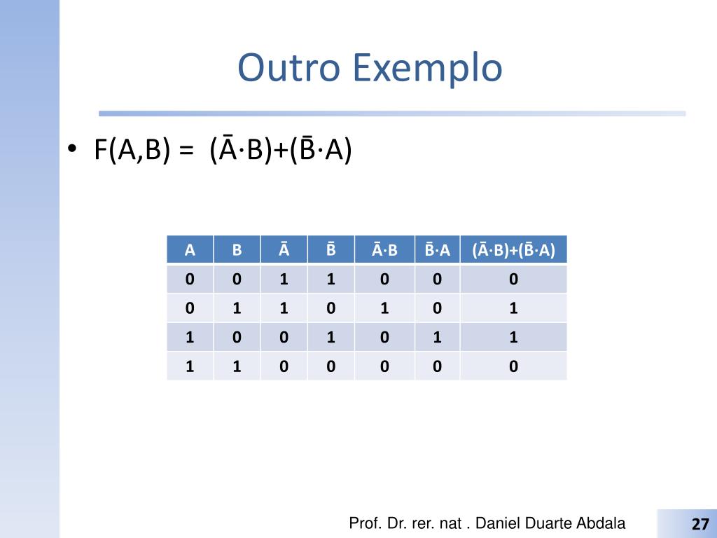 Outro Exemplo F(A,B) = (Ā⋅B)+(B̄⋅A) Prof. Dr. rer. nat . Daniel Duarte Abdala