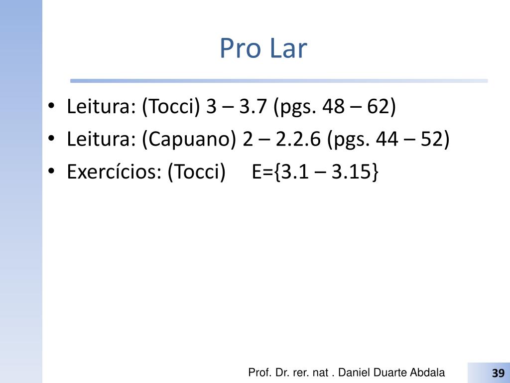 Pro Lar Leitura: (Tocci) 3 – 3.7 (pgs. 48 – 62) Leitura: (Capuano) 2 – 2.2.6 (pgs. 44 – 52) Exercícios: (Tocci) E={3.1 – 3.15} Prof. Dr. rer. nat . Daniel Duarte Abdala
