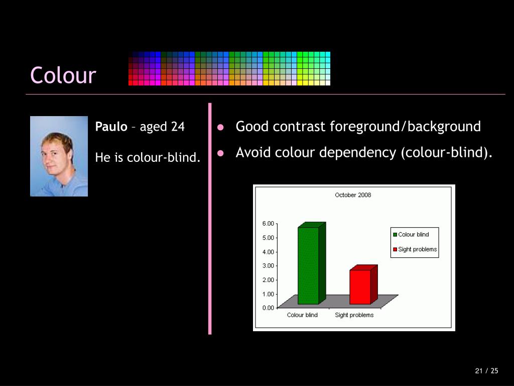 Colour • Good contrast foreground/background • Avoid colour dependency (colour-blind). Paulo – aged 24 He is colour-blind.