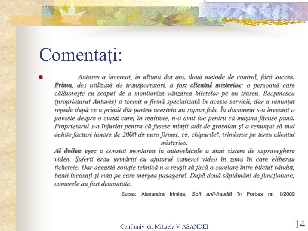 Comentaţi: • Antares a încercat, în ultimii doi ani, două metode de control, fără succes. Prima, des utilizată de transportatori, a fost clientul misterios: o persoană care călătoreşte cu scopul de a monitoriza vânzarea biletelor pe un traseu. Becşenescu (proprietarul Antares) a tocmit o firmă specializată în aceste servicii, dar a renunţat repede după ce a primit din partea acesteia un raport fals. În document s-a inventat o poveste despre o cursă care, în realitate, n-a avut loc pentru că maşina făcuse pană. Proprietarul s-a înfuriat pentru că fusese minţit atât de grosolan şi a renunţat să mai achite facturi lunare de 2000 de euro firmei, ce, chipurile!,trimisese peterenclientulmisterios.Al doilea eşec a constat montarea în autovehicule a unui sistem de supraveghere video. Şoferii erau urmăriţi cu ajutorul camerei video în zona în care eliberau tichetele. Dar această soluţie tehnică n-a reuşit să facă o corelare între biletul vândut, banii încasaţi şiruta pe care mergea pasagerul. După două săptămâni de funcţionare,camerele aufostdemontate. Sursa: Alexandra Irimiea, Soft anti-fraudă! în Forbes nr. 1/2009 Conf.univ. dr. Mihaela V. ASANDEI