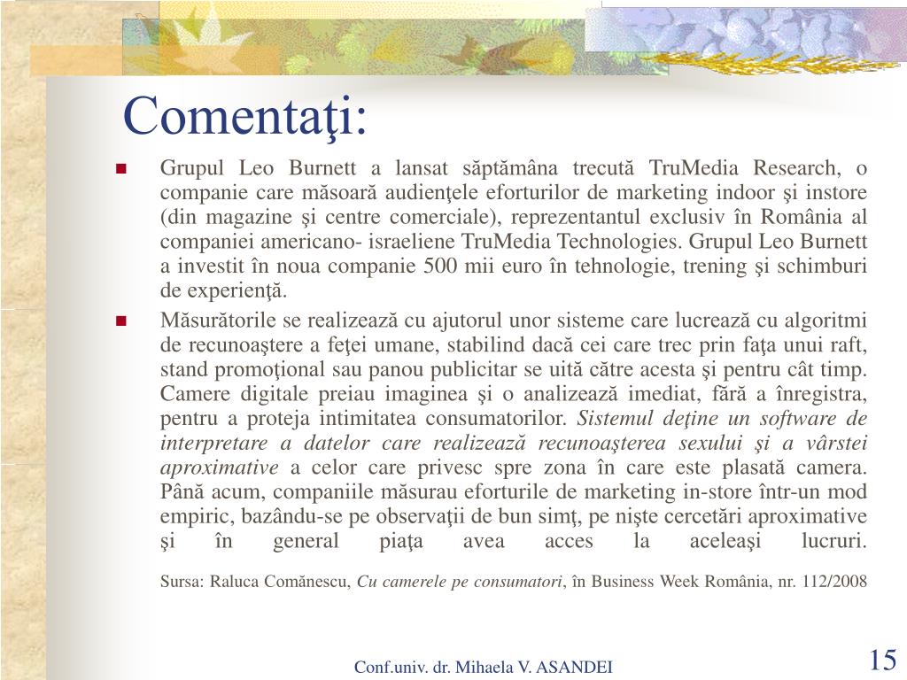 Comentaţi: • Grupul Leo Burnett a lansat săptămâna trecută TruMedia Research, o companie care măsoară audienţele eforturilor de marketing indoor şi instore (din magazine şi centre comerciale), reprezentantul exclusiv în România al companiei americano- israeliene TruMedia Technologies. Grupul Leo Burnett a investit în noua companie 500 mii euro în tehnologie, trening şi schimburideexperienţă. • Măsurătorile se realizează cu ajutorul unor sisteme care lucrează cu algoritmi de recunoaştere a feţei umane, stabilind dacă cei care trec prin faţa unui raft, stand promoţional sau panou publicitar se uită către acesta şi pentru cât timp. Camere digitale preiau imaginea şi o analizează imediat, fără a înregistra, pentru a proteja intimitatea consumatorilor. Sistemul deţine un software de interpretare a datelor care realizează recunoaşterea sexului şi a vârstei aproximative a celor care privesc spre zona în care este plasată camera.Până acum, companiile măsurau eforturile de marketing in-store într-un mod empiric, bazându-se pe observaţii de bun simţ, pe nişte cercetări aproximative şi în general piaţa avea acces la aceleaşi lucruri. Sursa: Raluca Comănescu, Cu camerele pe consumatori, în Business Week România, nr. 112/2008 Conf.univ. dr. Mihaela V. ASANDEI