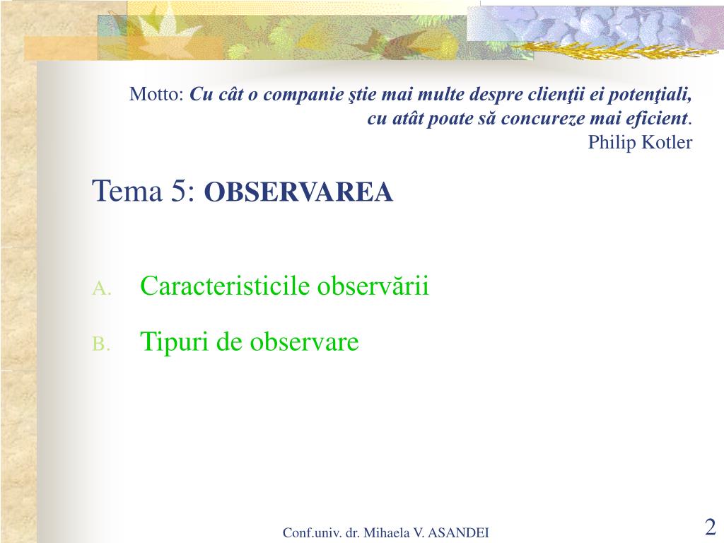 Motto: Cu cât o companie ştie mai multe despre clienţii ei potenţiali, cu atât poate să concureze mai eficient. Philip Kotler Tema 5: OBSERVAREA • Caracteristicile observării • Tipuri de observare Conf.univ. dr. Mihaela V. ASANDEI