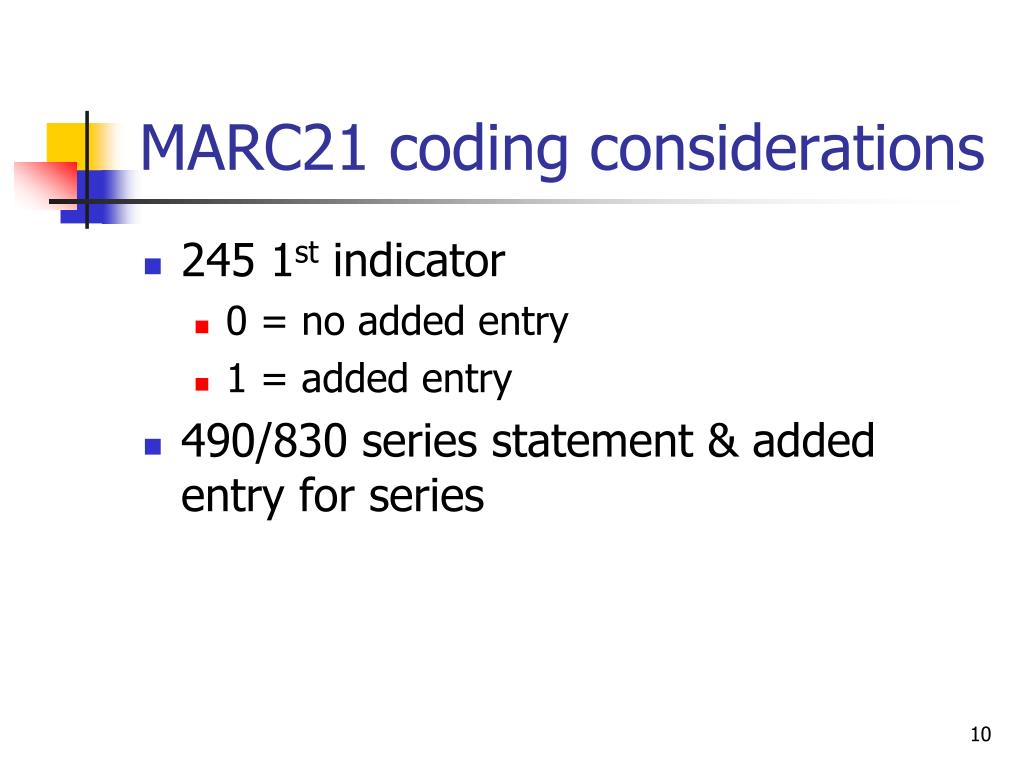 MARC21 coding considerations • 245 1st indicator • 0 = no added entry • 1 = added entry • 490/830 series statement & added entry for series