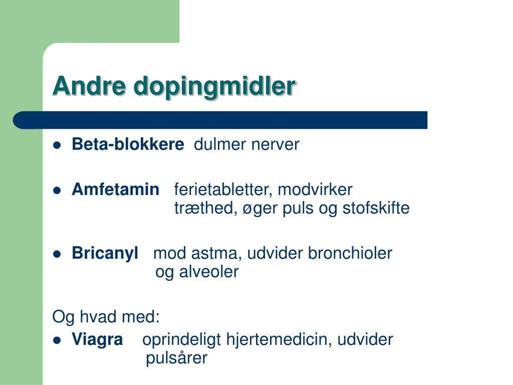 Andre dopingmidler • Beta-blokkere dulmer nerver • Amfetamin ferietabletter, modvirker træthed, øger puls og stofskifte • Bricanyl mod astma, udvider bronchioler og alveoler Og hvad med: • Viagra oprindeligt hjertemedicin, udvider pulsårer