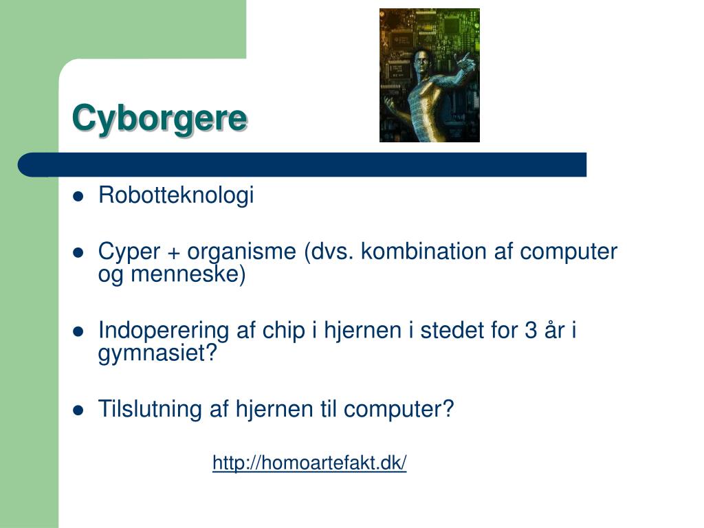 Cyborgere • Robotteknologi • Cyper + organisme (dvs. kombination af computer og menneske) • Indoperering af chip i hjernen i stedet for 3 år i gymnasiet? • Tilslutning af hjernen til computer? http://homoartefakt.dk/