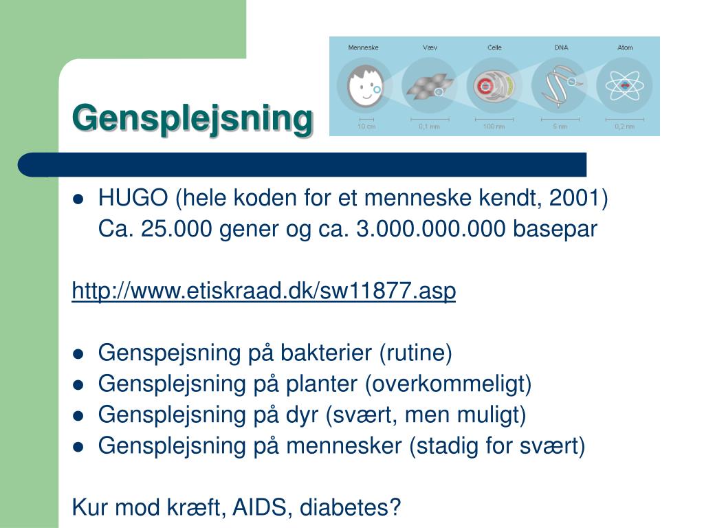 Gensplejsning • HUGO (hele koden for et menneske kendt, 2001) Ca. 25.000 gener og ca. 3.000.000.000 basepar http://www.etiskraad.dk/sw11877.asp • Genspejsning på bakterier (rutine) • Gensplejsning på planter (overkommeligt) • Gensplejsning på dyr (svært, men muligt) • Gensplejsning på mennesker (stadig for svært) Kur mod kræft, AIDS, diabetes?