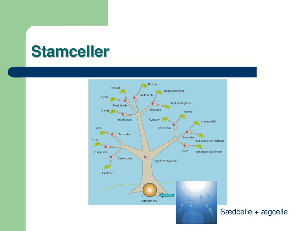 Fremskaffelse af stamceller Ca. 240 forskellige typer til at bygge et menneske (f.x. nervevæv, hjertevæv, blodceller osv.) - fra fosterceller (virker bedst) - fra navlestreng (er bedre etisk) - fra kroppen (der er meget få) Kur mod hjernesygdommene alzheimer, parkinson, skizofreni - eller hvad med en ny kopi af dit hjerte ?