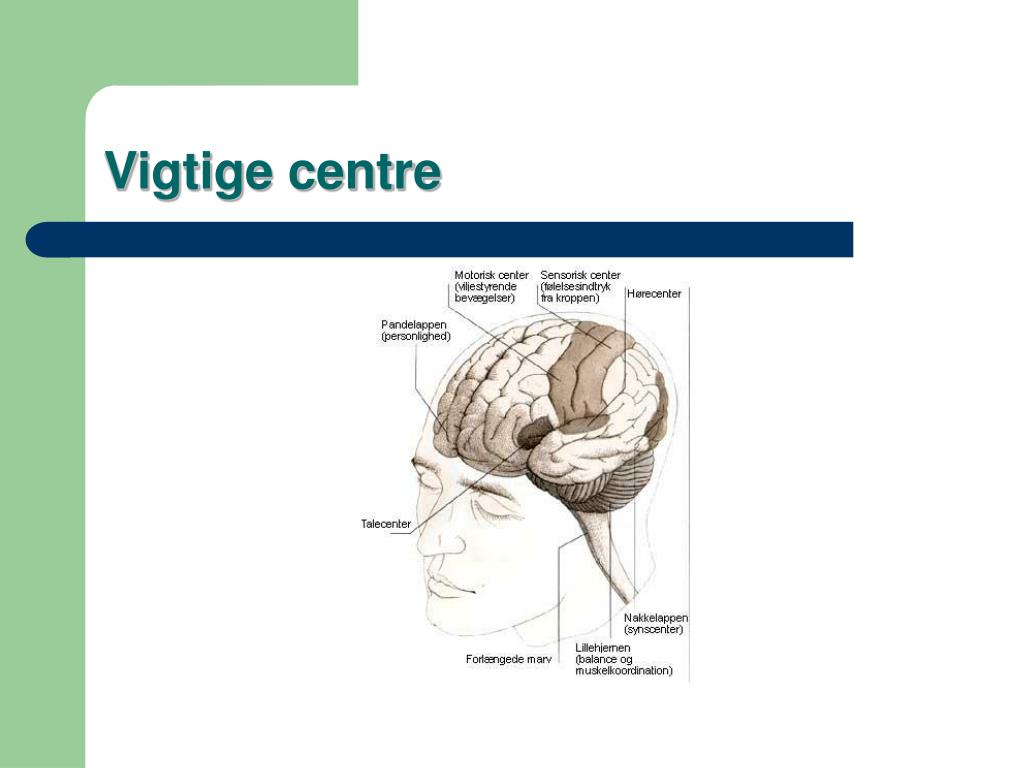 Længe kendte funktioner Storhjernen rummer komplicerede funktioner som intellekt, tolkning af følelser bearbejdning af sanseintryk o.a. Lillehjernen sørger normalt for koordination af vore bevægelser samt balancen Mellemhjernen styrer blodtryk, hjerterytme, krops-temperatur Den forlængede rygmarv styrer åndedræt og vågenhed Midthjernen styrer viljestyrede muskelbevægelser