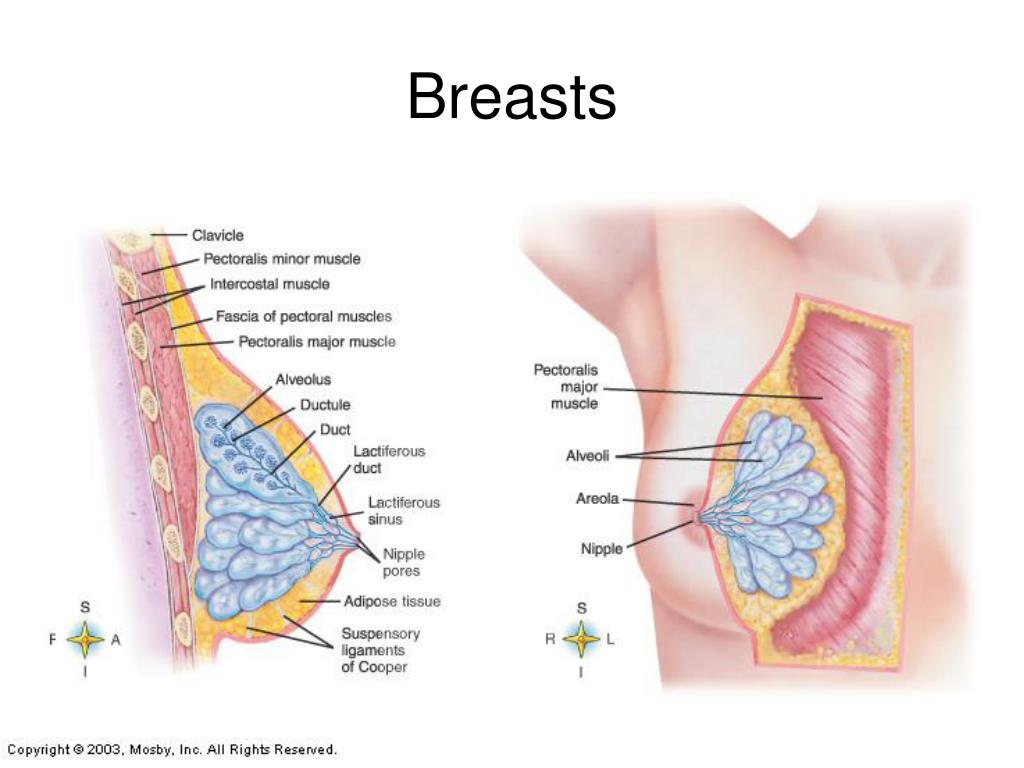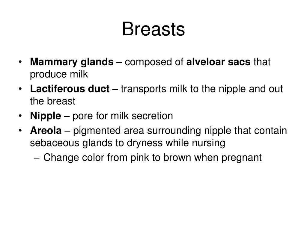Breasts • Mammary glands – composed of alveloar sacs that produce milk • Lactiferous duct – transports milk to the nipple and out the breast • Nipple – pore for milk secretion • Areola – pigmented area surrounding nipple that contain sebaceous glands to dryness while nursing • Change color from pink to brown when pregnant