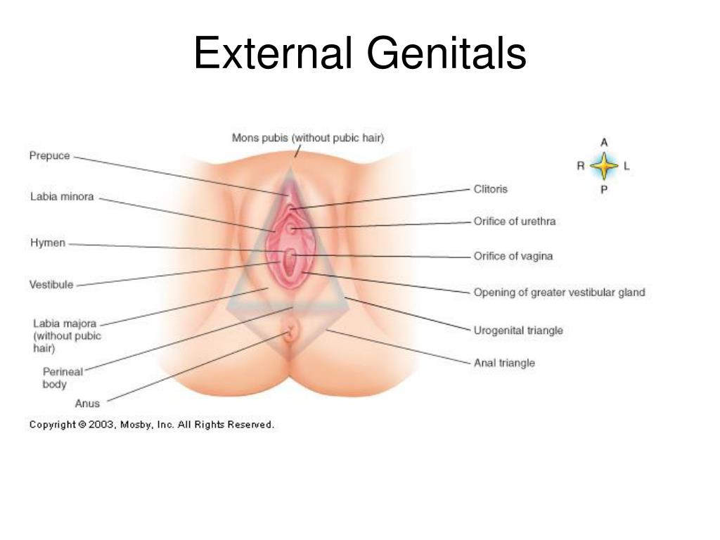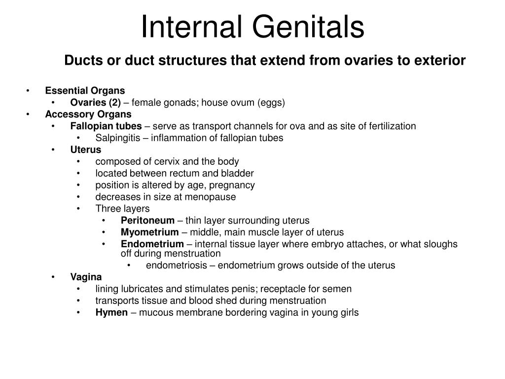 Internal Genitals • Ducts or duct structures that extend from ovaries to exterior • Essential Organs • Ovaries (2) – female gonads; house ovum (eggs) • Accessory Organs • Fallopian tubes – serve as transport channels for ova and as site of fertilization • Salpingitis – inflammation of fallopian tubes • Uterus • composed of cervix and the body • located between rectum and bladder • position is altered by age, pregnancy • decreases in size at menopause • Three layers • Peritoneum – thin layer surrounding uterus • Myometrium – middle, main muscle layer of uterus • Endometrium– internal tissue layer where embryo attaches, or what sloughs off during menstruation • endometriosis – endometrium grows outside of the uterus • Vagina • lining lubricates and stimulates penis; receptacle for semen • transports tissue and blood shed during menstruation • Hymen – mucous membrane bordering vagina in young girls