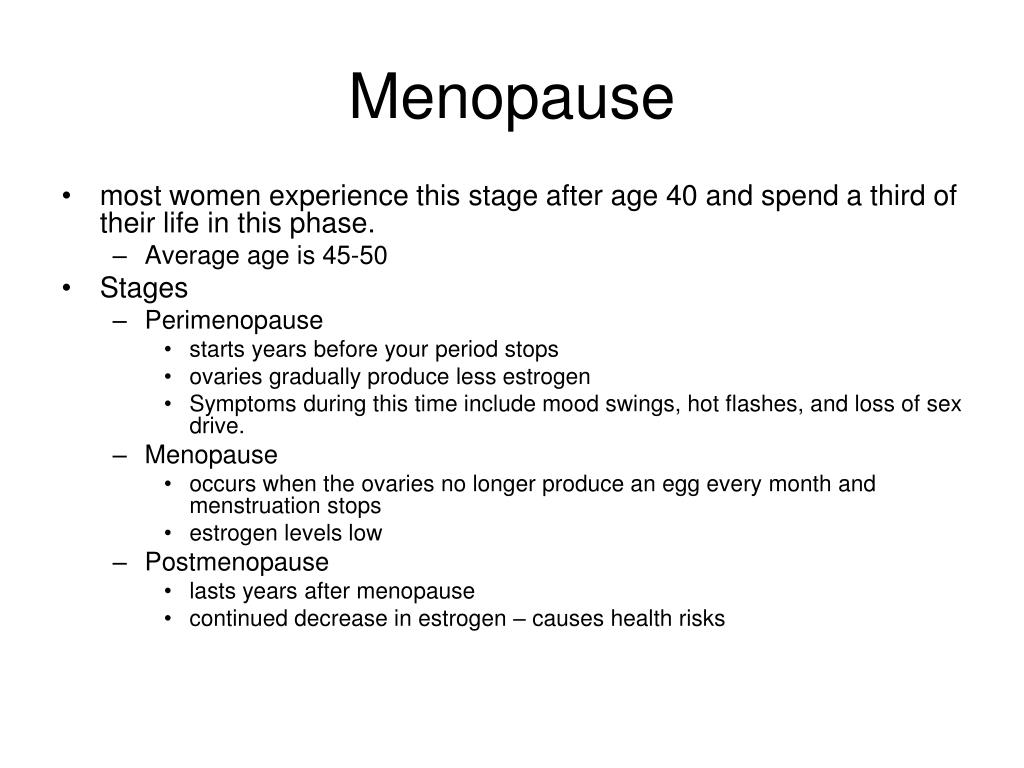 Menopause • most women experience this stage after age 40 and spend a third of their life in this phase. • Average age is 45-50 • Stages • Perimenopause • starts years before your period stops • ovaries gradually produce less estrogen • Symptoms during this time include mood swings, hot flashes, and loss of sex drive. • Menopause • occurs when the ovaries no longer produce an egg every month and menstruation stops • estrogen levels low • Postmenopause • lasts years after menopause • continued decrease in estrogen – causes health risks