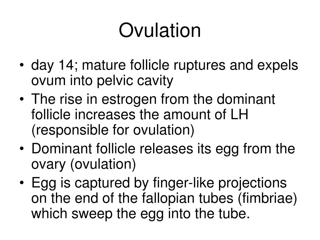 Ovulation • day 14; mature follicle ruptures and expels ovum into pelvic cavity • The rise in estrogen from the dominant follicle increases the amount of LH (responsible for ovulation) • Dominant follicle releases its egg from the ovary (ovulation) • Egg is captured by finger-like projections on the end of the fallopian tubes (fimbriae) which sweep the egg into the tube.