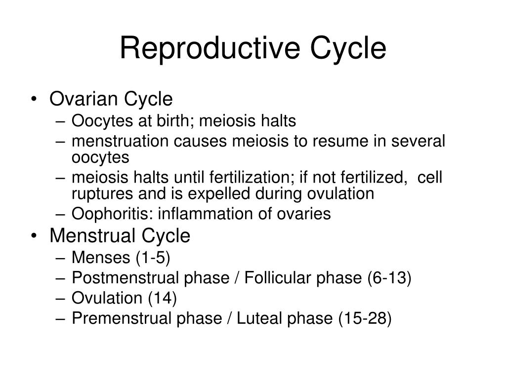 Reproductive Cycle • Ovarian Cycle • Oocytes at birth; meiosis halts • menstruation causes meiosis to resume in several oocytes • meiosis halts until fertilization; if not fertilized, cell ruptures and is expelled during ovulation • Oophoritis: inflammation of ovaries • Menstrual Cycle • Menses (1-5) • Postmenstrual phase / Follicular phase (6-13) • Ovulation (14) • Premenstrual phase / Luteal phase (15-28)
