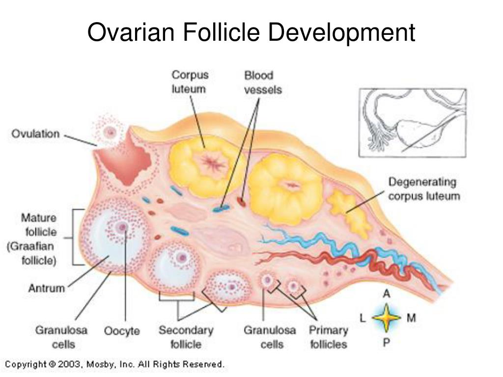 Postmenstrual / Follicular phase • time between menses and ovulation (days 6-13) • FSH and LH are released from the brain and travel in the blood to the ovaries. • The hormones stimulate the growth of about 15-20 eggs in the ovaries each in its own "shell," called a follicle and production of estrogen which changes in appearance, amount and consistency of cervical mucus • High estrogen levels turn off the production of FSH • One follicle in one ovary becomes dominant and continues to mature. Others stop growing and die. • The dominant follicle continues to produce estrogen.