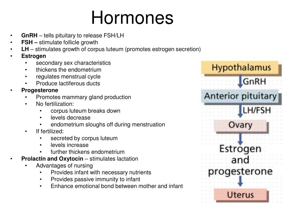 Hormones • GnRH– tells pituitary to release FSH/LH • FSH – stimulate follicle growth • LH – stimulates growth of corpus luteum (promotes estrogen secretion) • Estrogen • secondary sex characteristics • thickens the endometrium • regulates menstrual cycle • Produce lactiferous ducts • Progesterone • Promotes mammary gland production • No fertilization: • corpus luteum breaks down • levels decrease • endometrium sloughs off during menstruation • If fertilized: • secreted by corpus luteum • levels increase • further thickens endometrium • Prolactin and Oxytocin– stimulates lactation • Advantages of nursing • Provides infant with necessary nutrients • Provides passive immunity to infant • Enhance emotional bond between mother and infant