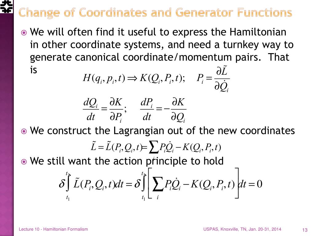 Change of Coordinates and Generator Functions Lecture 10 - Hamiltonian Formalism We will often find it useful to express the Hamiltonian in other coordinate systems, and need a turnkey way to generate canonical coordinate/momentum pairs. That is We construct the Lagrangian out of the new coordinates We still want the action principle to hold