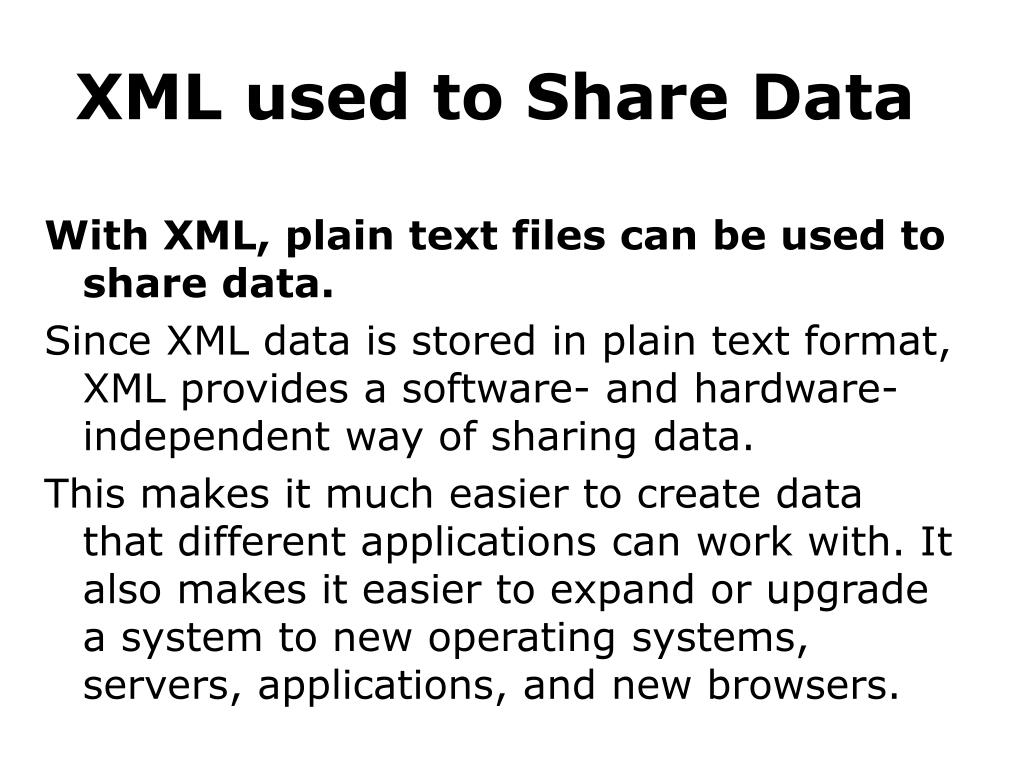 XML used to Share Data With XML, plain text files can be used to share data. Since XML data is stored in plain text format, XML provides a software- and hardware-independent way of sharing data. This makes it much easier to create data that different applications can work with. It also makes it easier to expand or upgrade a system to new operating systems, servers, applications, and new browsers.
