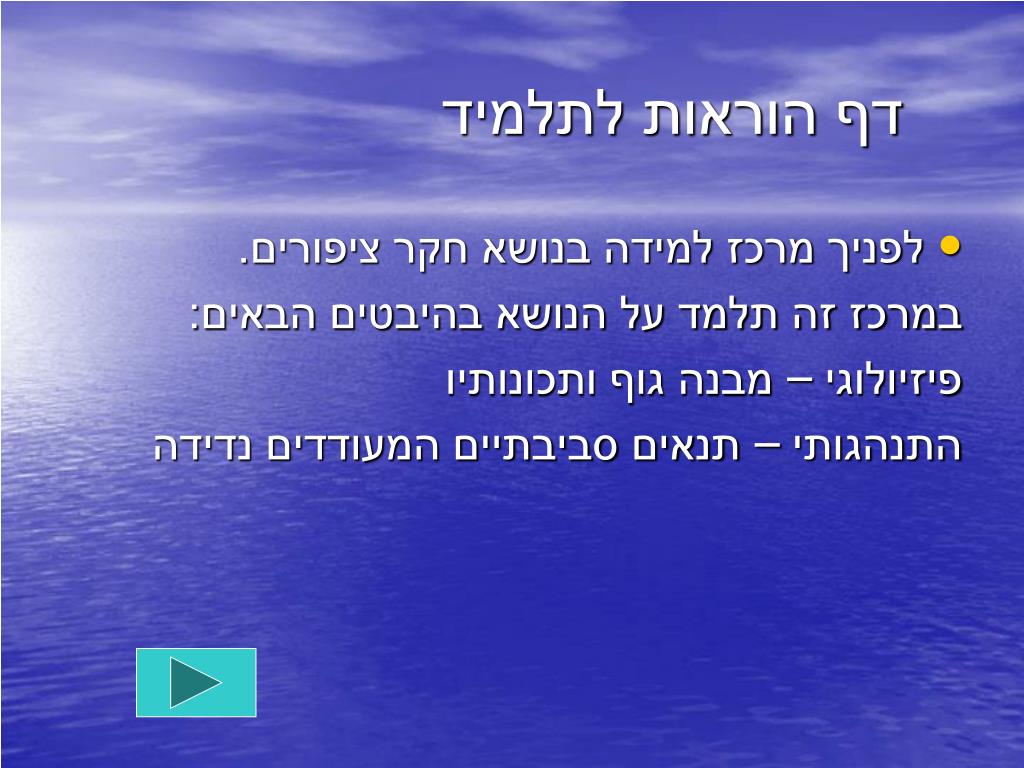 דף הוראות לתלמיד • לפניך מרכז למידה בנושא חקר ציפורים. במרכז זה תלמד על הנושא בהיבטים הבאים: פיזיולוגי – מבנה גוף ותכונותיו התנהגותי – תנאים סביבתיים המעודדים נדידה