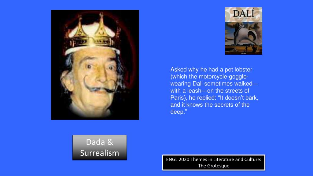 Asked why he had a pet lobster (which the motorcycle-goggle-wearing Dali sometimes walked—with a leash—on the streets of Paris), he replied: “It doesn’t bark, and it knows the secrets of the deep.” Dada & Surrealism ENGL 2020 Themes in Literature and Culture: The Grotesque