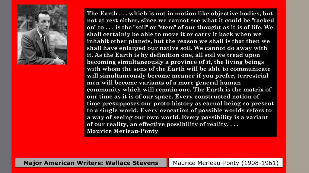 The Earth . . . which is not in motion like objective bodies, but not at rest either, since we cannot see what it could be "tacked on" to . . . is the "soil" or "stem" of our thought as it is of life. We shall certainly be able to move it or carry it back when we inhabit other planets, but the reason we shall is that then we shall have enlarged our native soil. We cannot do away with it. As the Earth is by definition one, all soil we tread upon becoming simultaneously a province of it, the living beings with whom the sons of the Earth will be able to communicate will simultaneously become meaner if you prefer, terrestrial men will become variants of a more general human community which will remain one. The Earth is the matrix of our time as it is of our space. Every constructed notion of time presupposes our proto-history as carnal being co-present to a single world. Every evocation of possible worlds refers to a way of seeing our own world. Every possibility is a variant of our reality, an effective possibility of reality. . . . Maurice Merleau-Ponty Major American Writers: Wallace Stevens Maurice Merleau-Ponty (1908-1961)
