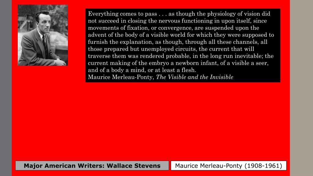 Everything comes to pass . . . as though the physiology of vision did not succeed in closing the nervous functioning in upon itself, since movements of fixation, or convergence, are suspended upon the advent of the body of a visible world for which they were supposed to furnish the explanation, as though, through all these channels, all those prepared but unemployed circuits, the current that will traverse them was rendered probable, in the long run inevitable; the current making of the embryo a newborn infant, of a visible a seer, and of a body a mind, or at least a flesh. Maurice Merleau-Ponty, The Visible and the Invisible Major American Writers: Wallace Stevens Maurice Merleau-Ponty (1908-1961)