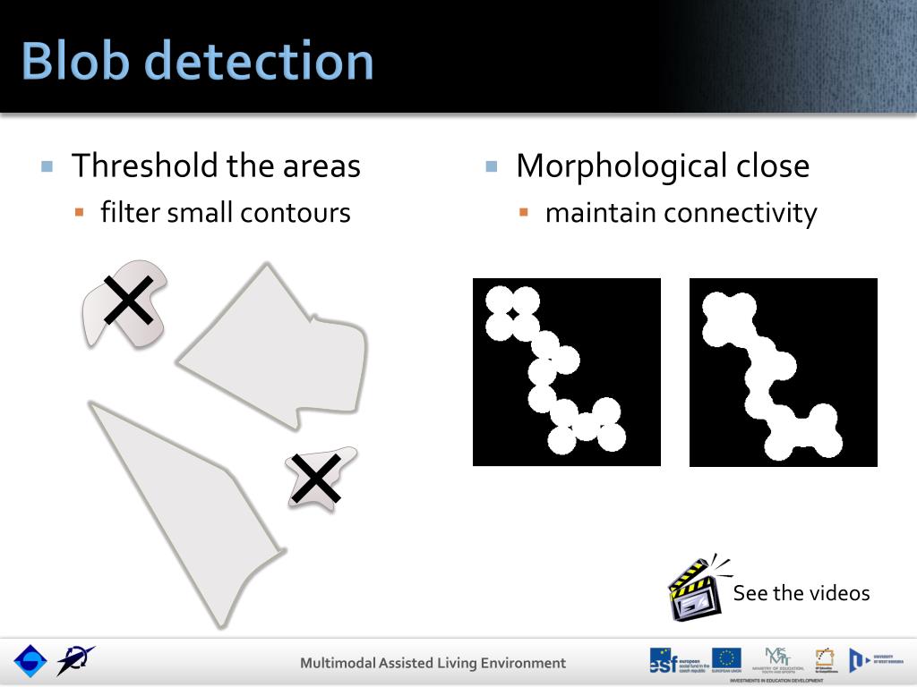 Blob detection • Threshold the areas • filter small contours • Morphological close • maintain connectivity × × See the videos Multimodal Assisted Living Environment