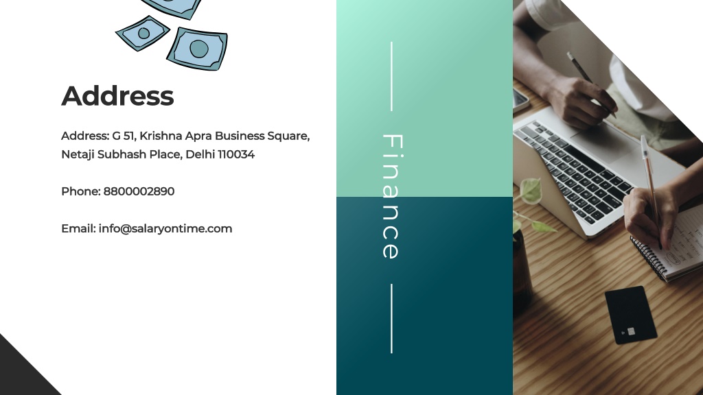 Address Address: G 51, Krishna Apra Business Square, Netaji Subhash Place, Delhi 110034 Phone: 8800002890 Email: info@salaryontime.com Finance