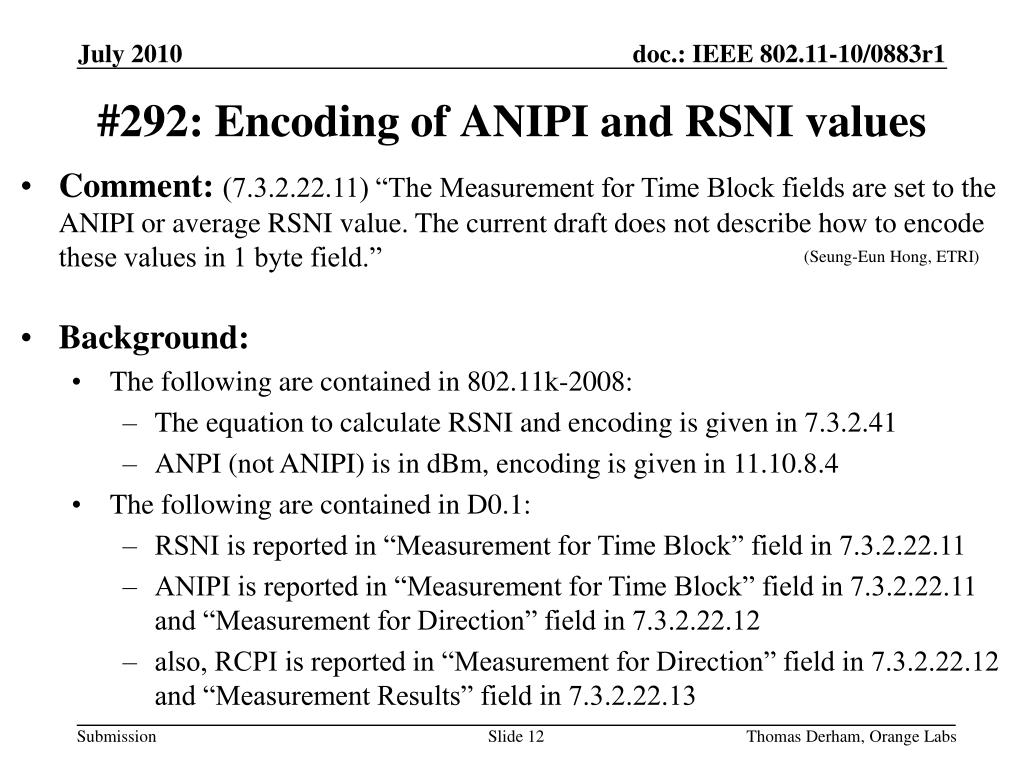 #292: Encoding of ANIPI and RSNI values • Comment: (7.3.2.22.11) “The Measurement for Time Block fields are set to the ANIPI or average RSNI value. The current draft does not describe how to encode these values in 1 byte field.” • Background: • The following are contained in 802.11k-2008: • The equation to calculate RSNI and encoding is given in 7.3.2.41 • ANPI (not ANIPI) is in dBm, encoding is given in 11.10.8.4 • The following are contained in D0.1: • RSNI is reported in “Measurement for Time Block” field in 7.3.2.22.11 • ANIPI is reported in “Measurement for Time Block” field in 7.3.2.22.11and “Measurement for Direction” field in 7.3.2.22.12 • also, RCPI is reported in “Measurement for Direction” field in 7.3.2.22.12 and “Measurement Results” field in 7.3.2.22.13 (Seung-Eun Hong, ETRI) Thomas Derham, Orange Labs