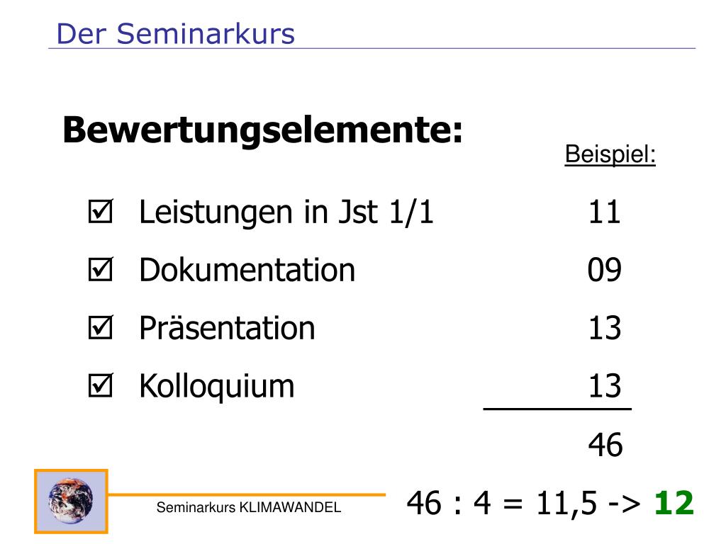 Der Seminarkurs Bewertungselemente: Beispiel: • Leistungen in Jst 1/1 11 • Dokumentation 09 • Präsentation 13 • Kolloquium 13 46 46 : 4 = 11,5 -> 12 Seminarkurs KLIMAWANDEL