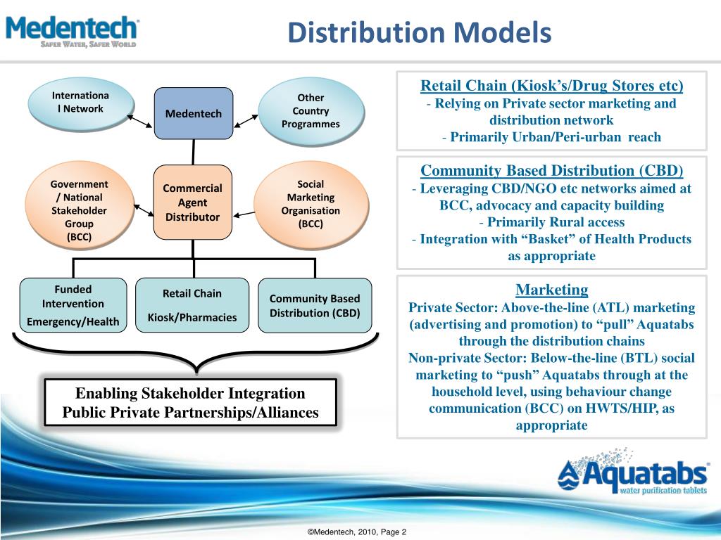 Distribution Models • Retail Chain (Kiosk’s/Drug Stores etc) • Relying on Private sector marketing and distribution network • Primarily Urban/Peri-urban reach International Network Other Country Programmes Medentech • Community Based Distribution (CBD) • Leveraging CBD/NGO etc networks aimed at BCC, advocacy and capacity building • Primarily Rural access • Integration with “Basket” of Health Products as appropriate Government / National Stakeholder Group (BCC) Social Marketing Organisation (BCC) Commercial Agent Distributor Marketing Private Sector: Above-the-line (ATL) marketing (advertising and promotion) to “pull” Aquatabs through the distribution chains Non-private Sector: Below-the-line (BTL) social marketing to “push” Aquatabs through at the household level, using behaviour change communication (BCC) on HWTS/HIP, as appropriate Retail Chain Kiosk/Pharmacies Funded Intervention Emergency/Health Community Based Distribution (CBD) Enabling Stakeholder Integration Public Private Partnerships/Alliances