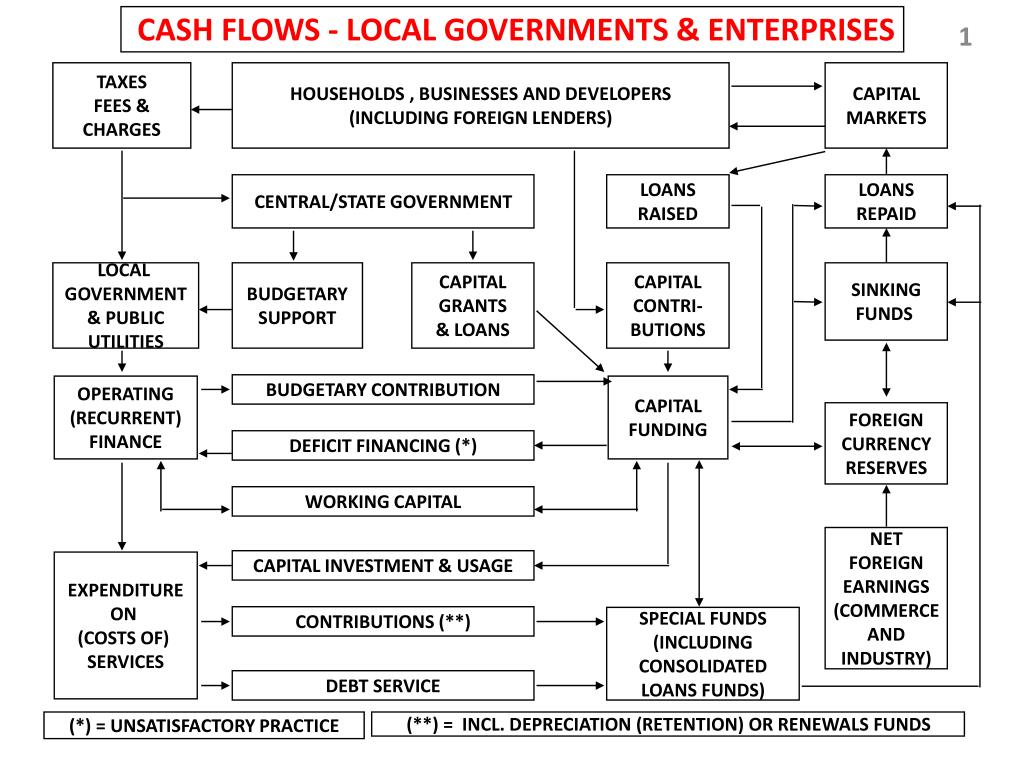 CASH FLOWS - LOCAL GOVERNMENTS & ENTERPRISES TAXES FEES & CHARGES HOUSEHOLDS , BUSINESSES AND DEVELOPERS (INCLUDING FOREIGN LENDERS) CAPITAL MARKETS CENTRAL/STATE GOVERNMENT LOANS RAISED LOANS REPAID LOCAL GOVERNMENT & PUBLIC UTILITIES BUDGETARY SUPPORT CAPITAL GRANTS & LOANS CAPITAL CONTRI- BUTIONS SINKING FUNDS BUDGETARY CONTRIBUTION OPERATING (RECURRENT) FINANCE CAPITAL FUNDING FOREIGN CURRENCY RESERVES DEFICIT FINANCING (*) WORKING CAPITAL NET FOREIGN EARNINGS (COMMERCE AND INDUSTRY) CAPITAL INVESTMENT & USAGE EXPENDITURE ON (COSTS OF) SERVICES CONTRIBUTIONS (**) SPECIAL FUNDS (INCLUDING CONSOLIDATED LOANS FUNDS) DEBT SERVICE (**) = INCL. DEPRECIATION (RETENTION) OR RENEWALS FUNDS (*) = UNSATISFACTORY PRACTICE