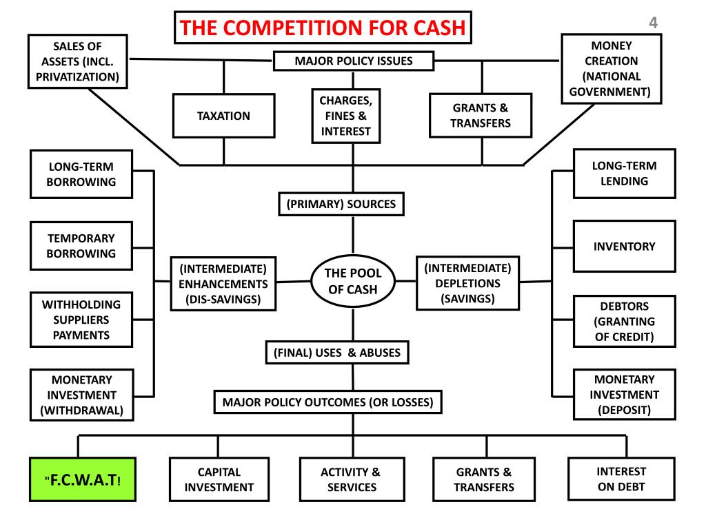 THE COMPETITION FOR CASH MONEY CREATION (NATIONAL GOVERNMENT) SALES OF ASSETS (INCL. PRIVATIZATION) MAJOR POLICY ISSUES CHARGES, FINES & INTEREST GRANTS & TRANSFERS TAXATION LONG-TERM LENDING LONG-TERM BORROWING (PRIMARY) SOURCES INVENTORY TEMPORARY BORROWING THE POOL OF CASH (INTERMEDIATE) DEPLETIONS (SAVINGS) (INTERMEDIATE) ENHANCEMENTS (DIS-SAVINGS) WITHHOLDING SUPPLIERS PAYMENTS DEBTORS (GRANTING OF CREDIT) (FINAL) USES & ABUSES MONETARY INVESTMENT (WITHDRAWAL) MONETARY INVESTMENT (DEPOSIT) MAJOR POLICY OUTCOMES (OR LOSSES) "F.C.W.A.T! CAPITAL INVESTMENT ACTIVITY & SERVICES GRANTS & TRANSFERS INTEREST ON DEBT