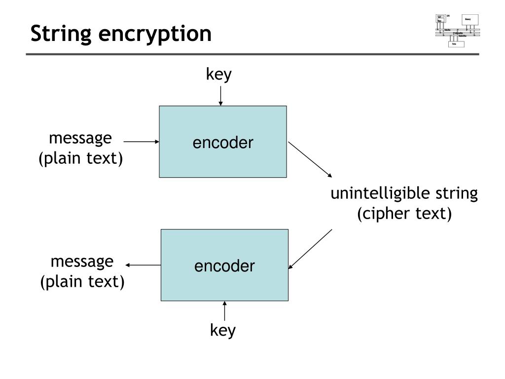 String encryption key encoder message (plain text) unintelligible string (cipher text) encoder message (plain text) key