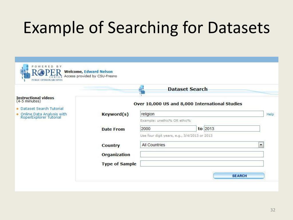 Search for Datasets • The “Search for Datasets” dialog box looks very similar to the iPOLL box. • Enter “religion” in the “Keyword(s)” box and use 2000 to 2013 for the date range. • The countries box allows you to search for surveys from a particular country. We’ll use the default which is “All Countries.” • Leave the other boxes blankand click on the “Search” button.