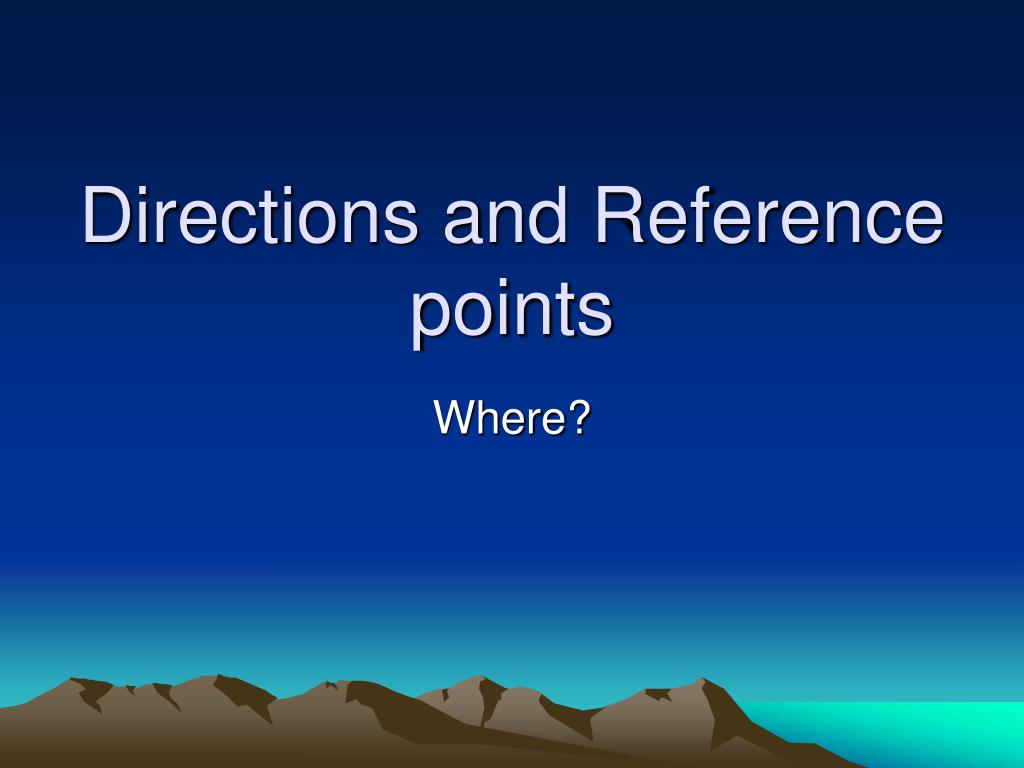 Directions and Reference points. Where?. Giving directions. Real world orientation Reference points Noun- verb agreement Pro nominalization Classifiers Space organization Eye gaze. Real world orientation. If you are giving directions to the nearest store from where you are: