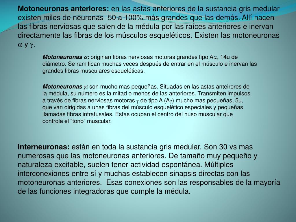 Motoneuronas anteriores: en las astas anteriores de la sustancia gris medular existen miles de neuronas 50 a 100% más grandes que las demás. Allí nacen las fibras nerviosas que salen de la médula por las raíces anteriores e inervan directamente las fibras de los músculos esqueléticos. Existen las motoneuronasa y g. Motoneuronasa: originan fibras nerviosas motoras grandes tipo Aa, 14u de diámetro. Se ramifican muchas veces después de entrar en el músculo e inervan las grandes fibras musculares esqueléticas. Motoneuronasg: son mucho mas pequeñas. Situadas en las astas anteirores de la médula, su número es la mitad o menos de las anteriores. Transmiten impulsos a través de fibras nerviosas motoras g de tipo A (Ag) mucho mas pequeñas, 5u, que van dirigidas a unas fibras del músculo esquelético especiales y pequeñas llamadas fibras intrafusales. Estas ocupan el centro del huso muscular que controla el “tono” muscular. Interneuronas: están en toda la sustancia gris medular. Son 30 vs mas numerosas que las motoneuronas anteriores. De tamaño muy pequeño y naturaleza excitable, suelen tener actividad espontánea. Múltiples interconexiones entre sí y muchas establecen sinapsis directas con las motoneuronas anteriores. Esas conexiones son las responsables de la mayoría de las funciones integradoras que cumple la médula.