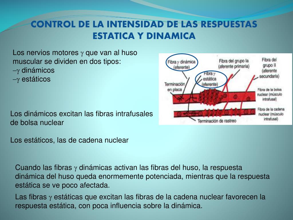 CONTROL DE LA INTENSIDAD DE LAS RESPUESTAS ESTATICA Y DINAMICA • Los nervios motores g que van al huso muscular se dividen en dos tipos: • g dinámicos • g estáticos Los dinámicos excitan las fibras intrafusales de bolsa nuclear Los estáticos, las de cadena nuclear Cuando las fibras g dinámicas activan las fibras del huso, la respuesta dinámica del huso queda enormemente potenciada, mientras que la respuesta estática se ve poco afectada. Las fibras g estáticas que excitan las fibras de la cadena nuclear favorecen la respuesta estática, con poca influencia sobre la dinámica.