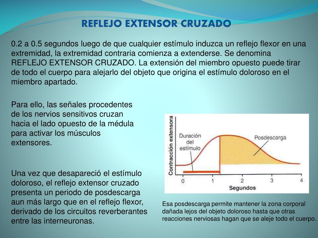 REFLEJO EXTENSOR CRUZADO 0.2 a 0.5 segundos luego de que cualquier estímulo induzca un reflejo flexor en una extremidad, la extremidad contraria comienza a extenderse. Se denomina REFLEJO EXTENSOR CRUZADO. La extensión del miembro opuesto puede tirar de todo el cuerpo para alejarlo del objeto que origina el estímulo doloroso en el miembro apartado. Para ello, las señales procedentes de los nervios sensitivos cruzan hacia el lado opuesto de la médula para activar los músculos extensores. Una vez que desapareció el estímulo doloroso, el reflejo extensor cruzado presenta un periodo de posdescarga aun más largo que en el reflejo flexor, derivado de los circuitos reverberantes entre las interneuronas. Esa posdescarga permite mantener la zona corporal dañada lejos del objeto doloroso hasta que otras reacciones nerviosas hagan que se aleje todo el cuerpo.
