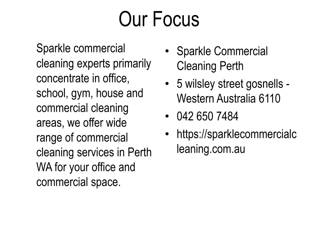 Our Focus Sparkle commercial cleaning experts primarily concentrate in office, school, gym, house and commercial cleaning areas, we offer wide range of commercial cleaning services in Perth WA for your office and commercial space. • Sparkle Commercial Cleaning Perth • 5 wilsley street gosnells - Western Australia 6110 • 042 650 7484 • https://sparklecommercialcleaning.com.au