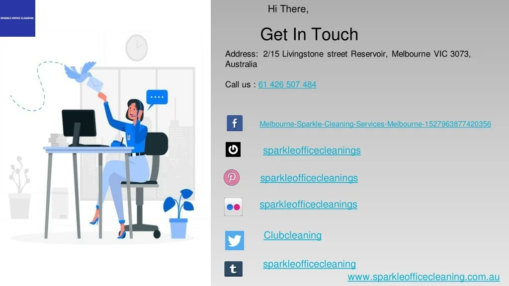 Hi There, Get In Touch Address: 2/15 Livingstone street Reservoir, Melbourne VIC 3073, Australia Call us : 61 426 507 484 Melbourne-Sparkle-Cleaning-Services-Melbourne-1527963877420356 sparkleofficecleanings sparkleofficecleanings sparkleofficecleanings Clubcleaning sparkleofficecleaning www.sparkleofficecleaning.com.au