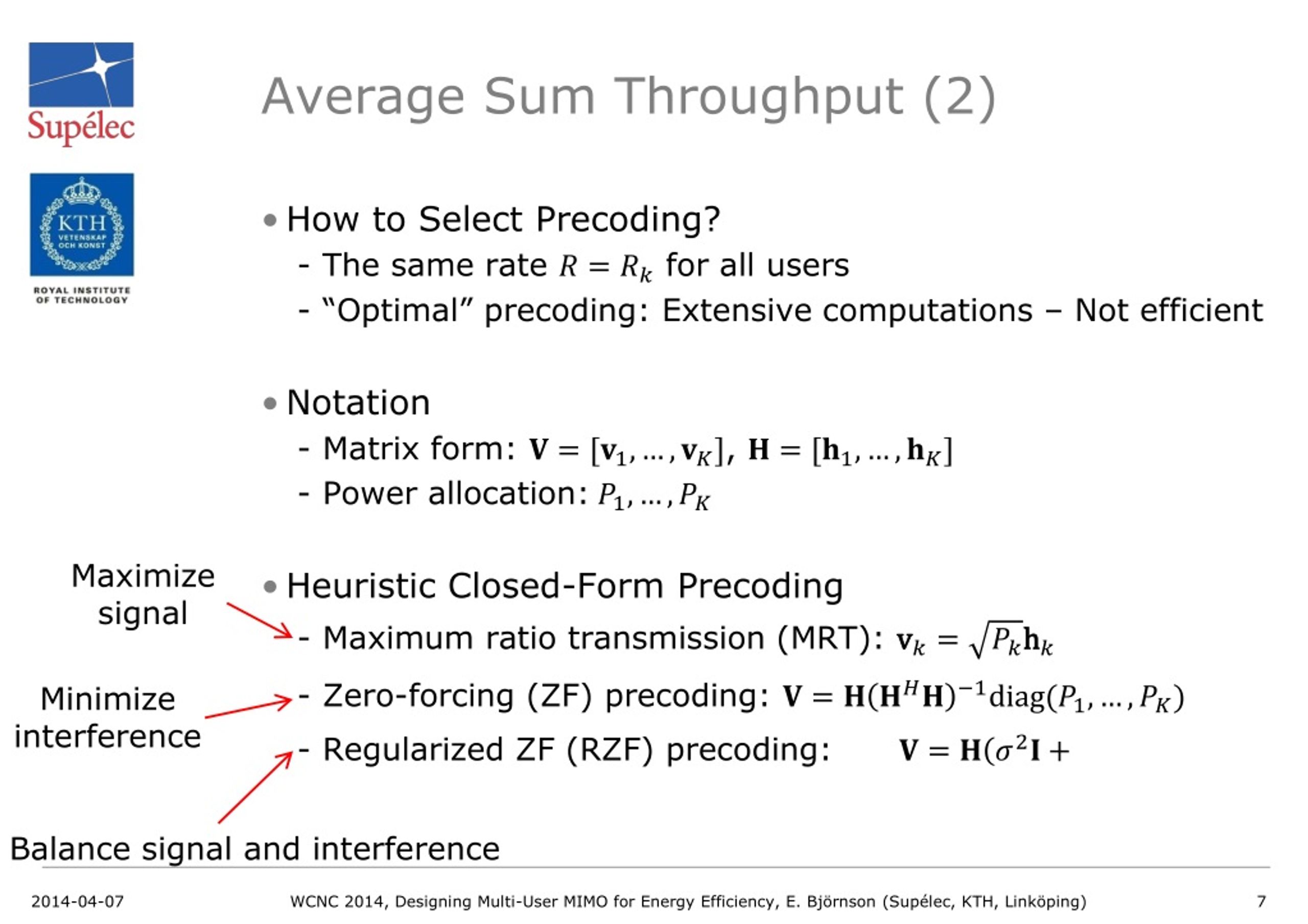 Average Sum Throughput (2) • How to Select Precoding? • The same rate for all users • “Optimal” precoding: Extensive computations – Not efficient • Notation • Matrix form: , • Power allocation: • Heuristic Closed-Form Precoding • Maximum ratio transmission (MRT): • Zero-forcing (ZF) precoding: • Regularized ZF (RZF) precoding: • Maximize • signal • Minimizeinterference • Balance signal and interference WCNC 2014, Designing Multi-User MIMO for Energy Efficiency, E. Björnson (Supélec, KTH, Linköping)