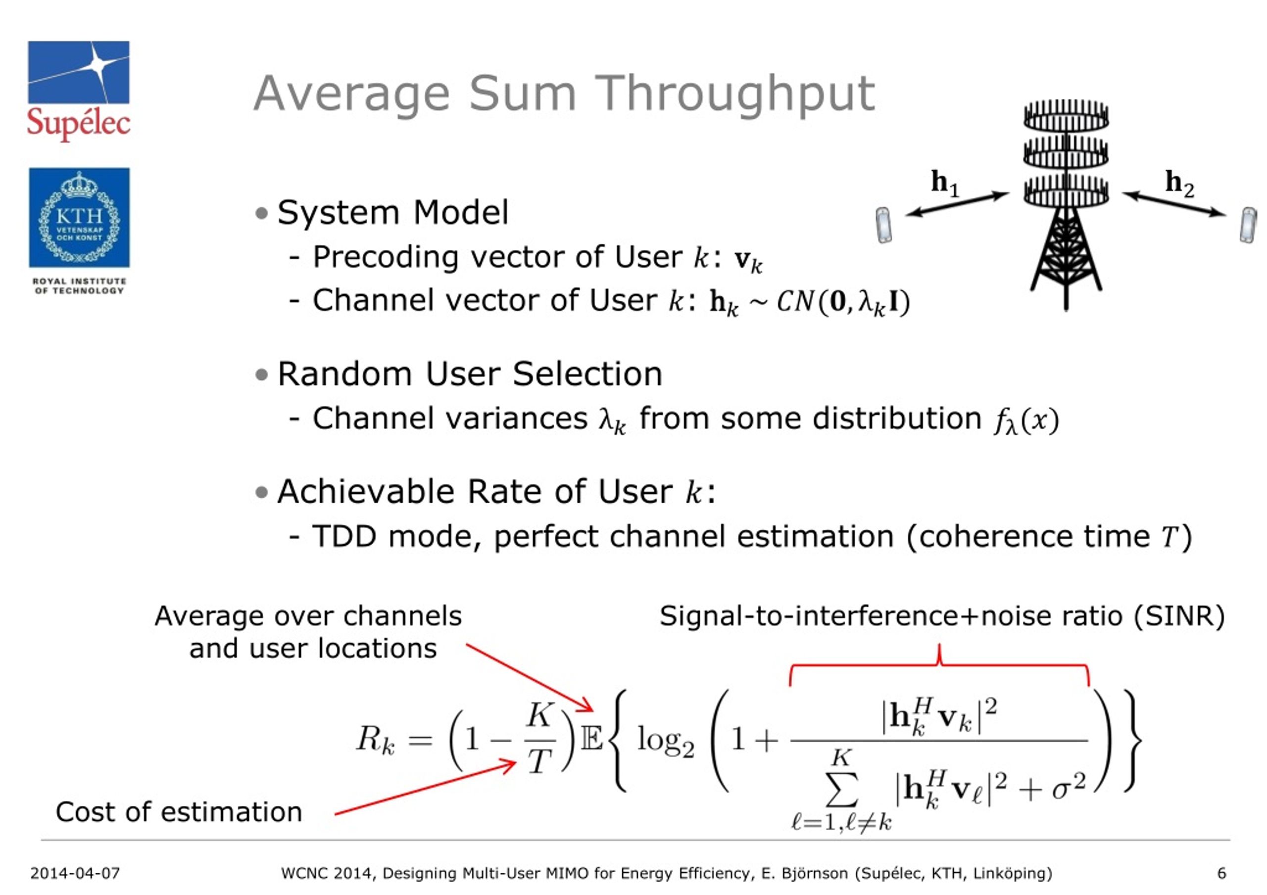 Average Sum Throughput • System Model • Precoding vector of User : • Channel vector of User : • Random User Selection • Channel variances from some distribution • Achievable Rate of User : • TDD mode, perfect channel estimation (coherence time ) • Average over channels and user locations • Signal-to-interference+noise ratio (SINR) • Cost of estimation WCNC 2014, Designing Multi-User MIMO for Energy Efficiency, E. Björnson (Supélec, KTH, Linköping)