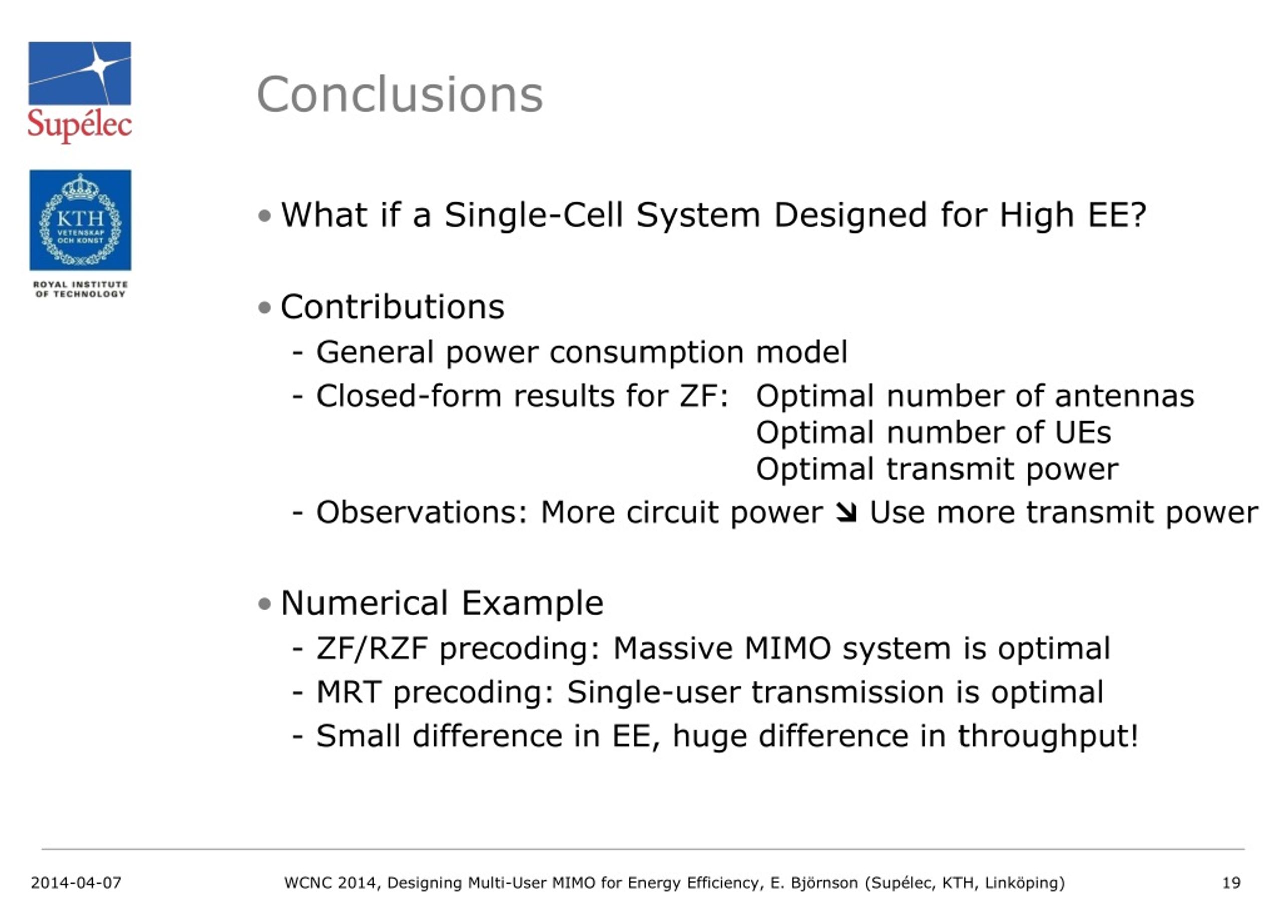 Conclusions WCNC 2014, Designing Multi-User MIMO for Energy Efficiency, E. Björnson (Supélec, KTH, Linköping)