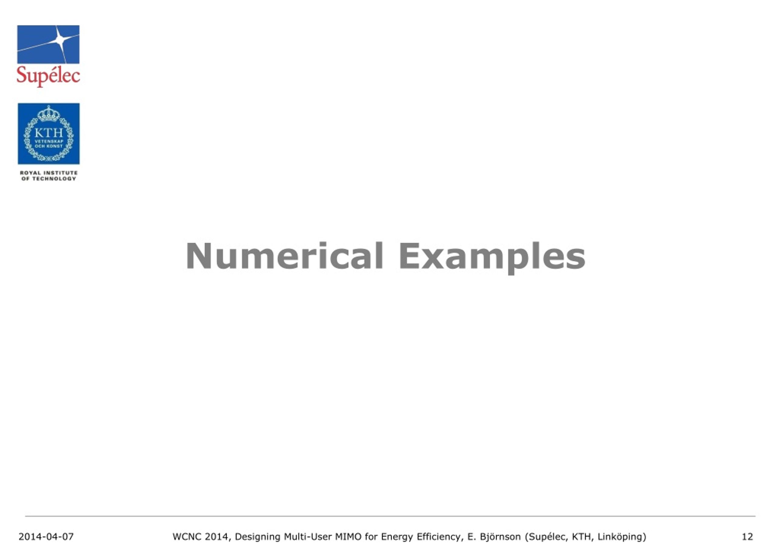 Numerical Examples WCNC 2014, Designing Multi-User MIMO for Energy Efficiency, E. Björnson (Supélec, KTH, Linköping)